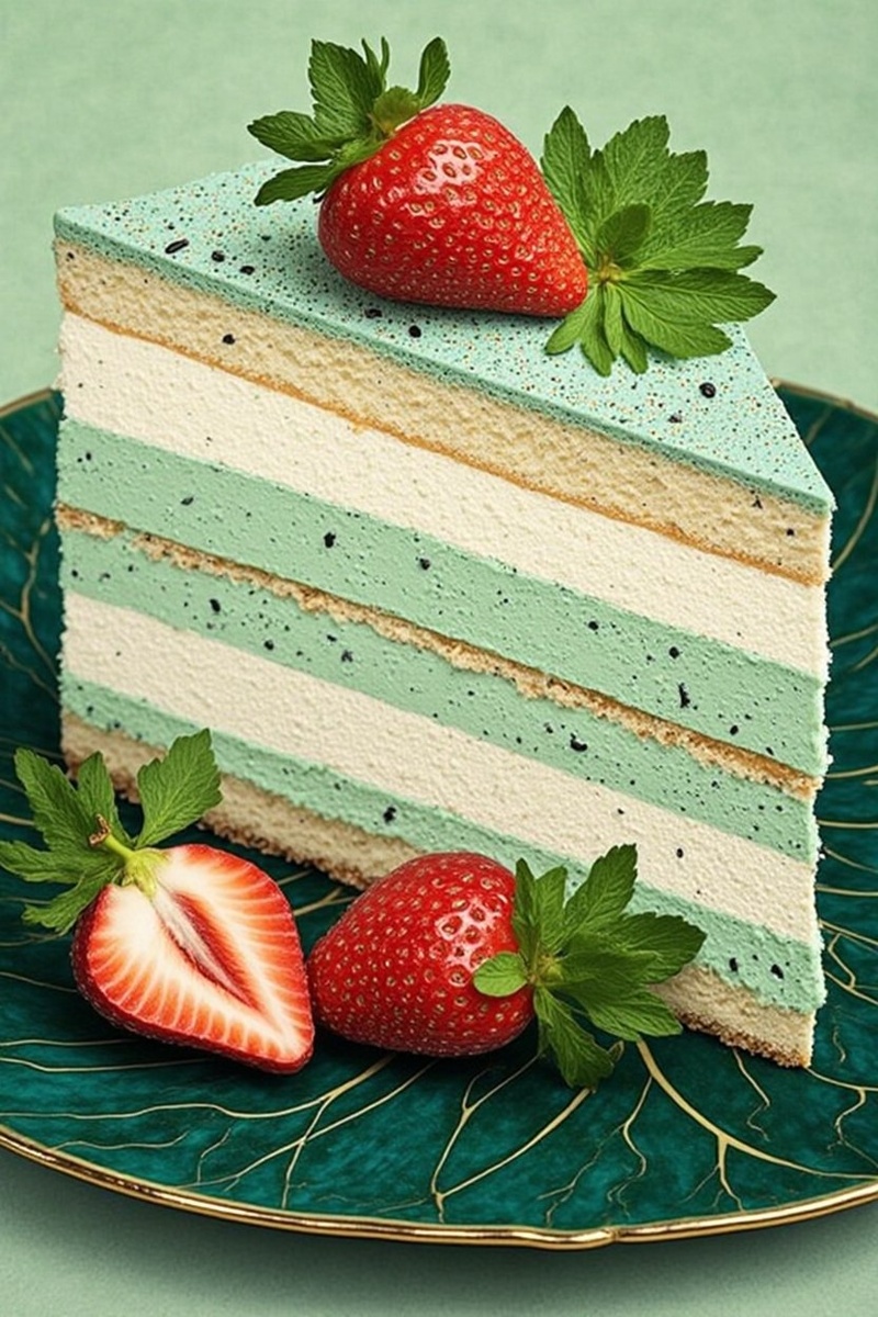 Нейросеть: Leonardo. Preset: Flux Dev. Elements: Vibrant Iridescence Painting/Soft pastel anime-5. Промпт: На фото представлен кусочек слоеного торта на декоративной тарелке в форме листа. Торт состоит из чередующихся слоев светло-зеленой и кремовой начинки, посыпанной маком, и тонких слоев бисквита. Верх торта украшен двумя половинками клубники, которые раскрывают их ярко-красную сердцевину и белые косточки, а также листочками свежей мяты. Тарелка темно-зеленого цвета с золотыми вставками, имитирующими прожилки листьев, расположена на зеленой поверхности в тон им, подчеркивая естественную тематику оформления. Общая композиция элегантна и визуально привлекательна, подчеркивая контраст между мягкой текстурой торта и замысловатым дизайном тарелки. #цифроваяживопись #нейросеть #рисунок #нейроарт #арт #идеи #цифровоефото #SD #нейрофото #артыотнейросетей #digitalart #DigitalDreamscapes #leonardo #нейроSD #ai #иллюстрация #бесплатныйарт #торт #еда #a Показать полностью...