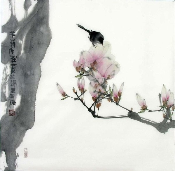 Тончайшая наблюдательность и сдержанная эмоциональность — так можно охарактеризовать стиль Цинь Тяньжу (род. 1952), китайского мастера живописи гохуа. В своих работах он не стремится к эффектности: его птицы молчат, растения не цветут буйно, а вода не плещется. Но именно в этой тишине и покое — жизнь, движение, дыхание. Цинь Тяньжу работает в жанре "цветы и птицы", однако далеко уходит от декоративности. Его композиции — это всегда тонко выстроенное равновесие между пустотой и формой, между телесностью туши и прозрачностью воды. Он умеет передать объем через намёк, и эмоцию — через сдержанность. Птица на краю ветки, чуть заметный наклон головы, выцветшие листья, лишённые пышности — всё это складывается в очень живую, почти кинематографичную сцену. Отдельно стоит отметить цвет. В его палитре нет случайных пятен: красный, зелёный, серый, охра — используются точно, дозированно, не для украшения, а для акцента. Даже самые яркие детали остаются частью целого, не нарушая внутренней гармонии