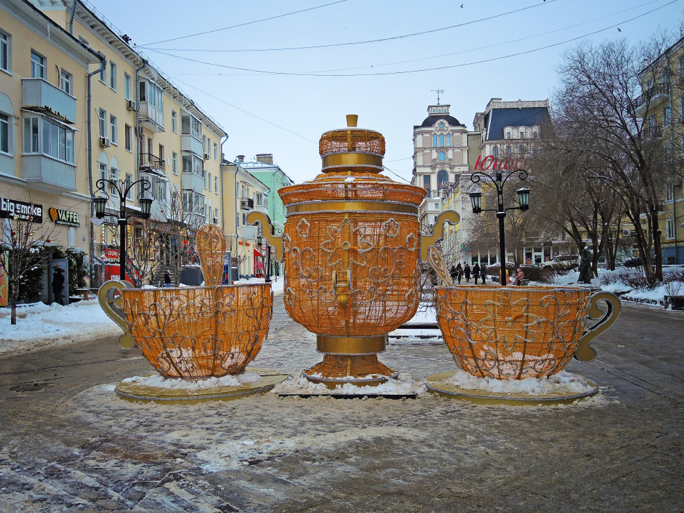 Я продолжаю фотопрогулку по пешеходной части улицы Ленинградской в Самаре, украшенной к новогодним праздникам сезона НГ2026. Наконец-то мы добрались до окончательного полного варианта оформления. Этот путь получился растянутым по времени. Прямо как в жизни. Нам всем пришлось долго ждать результата. Не могу в полной мере сказать, что это ожидание того стоило. Однако, совершенно точно настолько масштабно улицу никогда ещё не украшали. Материала получилось много, чтобы не перегружать, разбил его на несколько частей. В этой подборке мы пройдём от улицы Галактионовской почти до Чапаевской. Пересечение с улицей Галактионовской. Как показывал в предыдущей части, здесь установили самовар с чашкой. В финальном варианте - с двумя чашками. Композиция очень понравилась. Только, повторюсь, не понял, почему не поставили всё сразу. Во время первой прогулки чашка была только одна. Пересечение с улицей Молодогвардейской. На мой взгляд, самая неудачная часть. Вернее, единственная неудачная. Главный мину