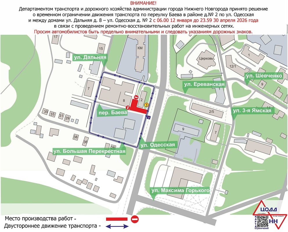 Движение по переулку Баева в Нижнем Новгороде из-за ремонтных работ ограничат до конца апреля. Об этом сообщает пресс-служба администрации города. Вы ещё не с нами в Telegram? Подписывайтесь, всё самое интересное тут! Ограничения вступят в силу с 06.00 12 января и продлятся до 23.59 30 апреля. Ремонтно-восстановительные работы пройдут на участке в районе дома №2 по улице Одесской и между домами №8 по улице Дальней и №2 по улице Одесской. Проезд по переулку Баева будет закрыт, объезд организуют по прилегающим улицам. Специалисты рекомендуют автомобилистам быть предельно внимательными и следовать указаниям дорожных знаков. Напомним, что редакция сайта pravda-nn.ru создала telegram-канал «Проезда нет», где оперативно сообщается об участках перекрытых дорог в Нижнем Новгороде. Подписывайтесь, чтобы быть в курсе! Ранее на сайте pravda-nn.ru сообщалось, какие транспортные изменения ждут нижегородцев в январе. Вы ещё не с нами в Telegram? Подписывайтесь, всё самое интересное тут! Ещё новост