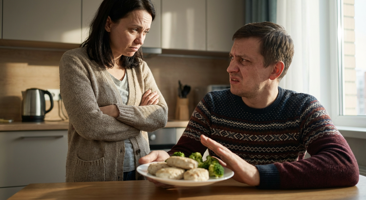 Ирина медленно вытерла руки полотенцем, глубоко вдохнула и повернулась к мужу. Сергей сидел с таким видом, будто его только что заставили съесть лимон целиком. Он ковырял вилкой брокколи, всем своим видом показывая страдание мученика.