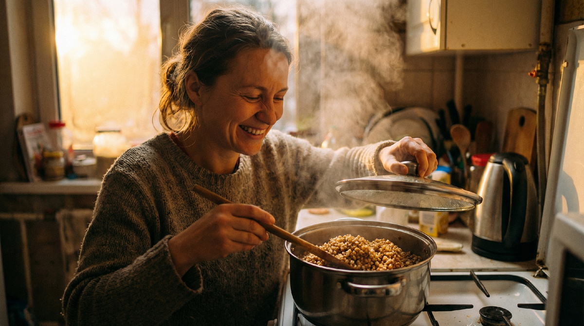 Я схватила лопатку. Сначала гречка просто парила — испарялась лишняя вода. Но через пару минут произошло что-то странное. По кухне поплыл аромат.
