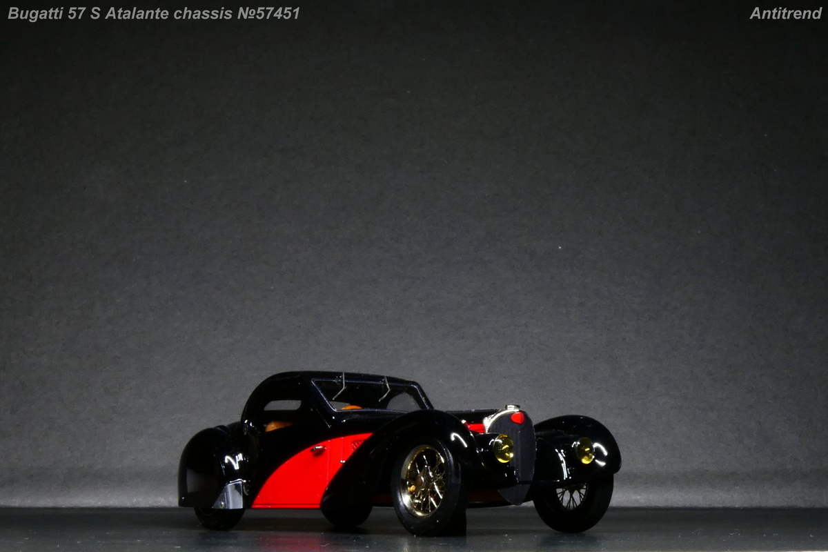 Производство - НеСо Modeles, Каталожный номер - 202 Материал - смола, Цвет - черно-красный, Серия - Serie 100 (модели тиражом 100 штук), Тираж - 100 экземпляров, Номер экземпляра - 28, Сделано во Франции. Модель не из самых старых, 1993 года, однако все ещё со "старвм" типом спицованные колес, где использовалась проволока, а не травление. Модель воспроизводит прототип в том виде, в котором он находился на момент её изготовления в музее Шлюмпфов. Я бы сказал, что это модель промежуточного этапа в эволюции НеСо - она уже не из простейших начала производства в 80-е годы, отличается более высокой детализацией, качественной окраской, но ещё далека от вершин фирмы 2000-х годов. Помимо спиц, можно обратить внимание на достаточно простое красное пятно на радиаторе вместо полноценной эмблемы Бугатти, сам радиатор ещё без травленой решетки, столь же простое остекление салона цельной пластиковой "ванной". В то же время на модели уже есть травленая рамка лобового стекла, дворники, копийные задни