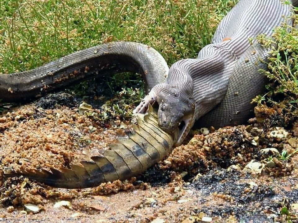 Угадаете страну по фото? Да-да, вы всё правильно поняли: огромная змея на ваших глазах целиком заглатывает крокодила. Ну конечно же, дело происходит в Австралии. А главный герой этого леденящего душу снимка – оливковый питон. Змеюка эта вырастает более 4 метров в длину и, чтобы прокормить такую тушу, ест всё, до чего могут дотянуться её потрясающие челюсти. Грызуны, птицы, лягушки, ящерицы и змеи поменьше – это просто лёгкий перекус, а чтобы наесться как следует и потом неделями лежать себе лениво под австралийским солнышком, сыто жмурясь, нужна добыча побольше. Вот и нападают время от времени оливковые питоны на местных узкорылых крокодилов, как, впрочем, и на другую добычу, отличающуюся серьёзными габаритами – например, на кенгуру. Ловкий, быстрый и очень сильный, питон зачастую успевает взять жертву в удушающий захват раньше, чем та опомнится. Удаётся это ему не в последнюю очередь потому, что оливковый питон великолепный пловец и способен наносить неожиданные удары броском из-под в