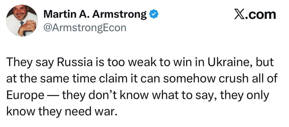 : Говорят, что Россия слишком слаба, чтобы победить в Украине, но в то же время утверждают, что она каким-то образом может разгромить всю Европу. Они не знают, что сказать, они только знают, что им нужна война. #этимвсесказано 🚲 Подпишись на Телега Online