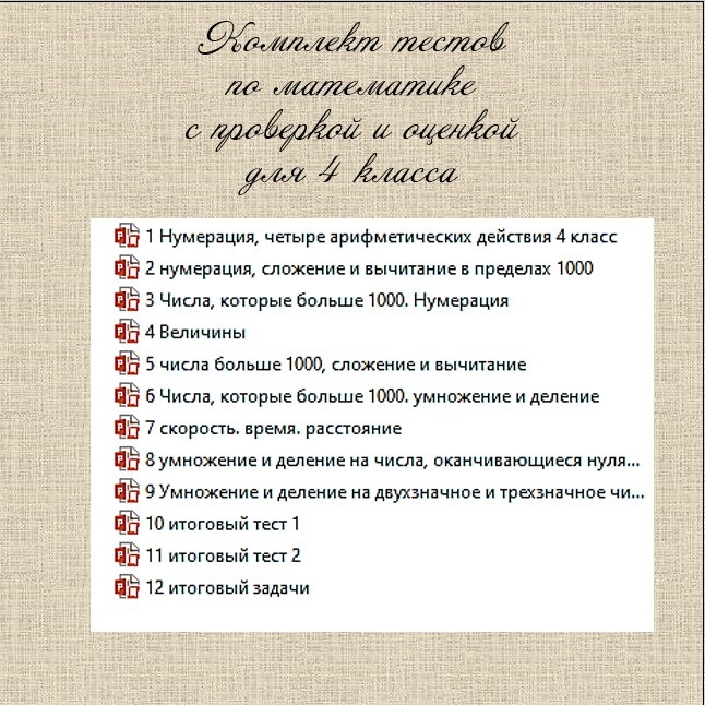 В комплект входит 12 тестов: 1. Нумерация, четыре арифметических действия. 2. Нумерация, сложение и вычитание в пределах 1000. 3. Числа, которые больше 1000. Нумерация. 4. Величины. 5. Числа больше 1000, сложение и вычитание. 6. Числа, которые больше 1000, умножение и деление. 7. Скорость, время, расстояние. 8. Умножение и деление на числа, оканчивающиеся нулями. 9. Умножение и деление на двузначное и трехзначное число. 10. Итоговый тест №1. 11. Итоговый тест №2. 12. Итоговый тест, задачи. В каждом тесте по 12-15 вопросов. Главное преимущество тестов заключается в их автоматической проверке! Учащиеся отвечают на вопросы и, подойдя к концу, одним нажатием кнопки “Показать результат” увидят свои достижения. Перед тем как начать, ознакомьтесь с файлом “Технические особенности при запуске игр”, чтобы избежать возможных трудностей. Цена комплекта 800 руб. Приобрести комплект можно по ссылке payform.ru/b7akZfA/