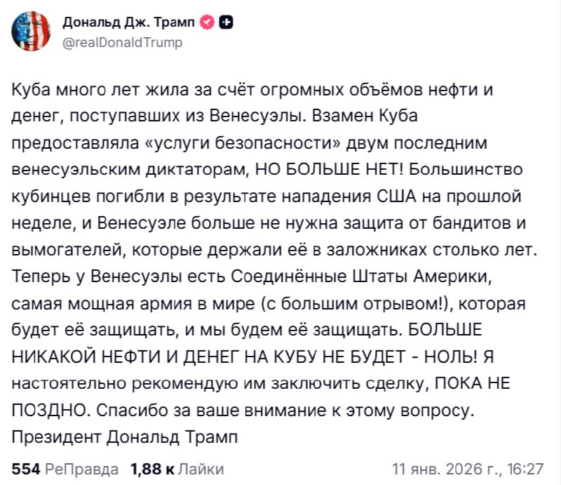 В ноябре прошлого года Reuters писало, что импорт сырой нефти и топлива на Кубу за 10 месяцев 2025 года сократился более чем на треть по сравнению с аналогичным периодом 2024 года. Под давлением Трампа, в период с января по октябрь 2025 года, импорт нефти на Кубу из Мексики, которая стала основным поставщиком нефти с 2023 года, сократился примерно до 5000 баррелей в сутки, что на 73% меньше, чем 18 800 баррелей в сутки, полученных за тот же период в 2024 году. Все это привело к ежедневным отключениям электроэнергии. По последним данным Мексика ежедневно поставляла на Кубу в среднем 12 284 баррелей, что составляло 44% от общего объема импорта нефти Кубой. Теперь Трамп отрезает Венесуэлу — это примерно 30% текущего импорта нефти Кубой. Пока непонятно про нефтепродукты (масла, бензин), а это может быть и до 60% импорта Кубы. Кто будет спасать Кубу от Трампа – вопрос риторический…
