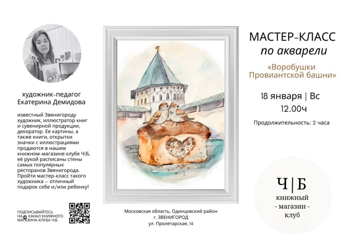 18 января в 12.00 приглашаем вас и ваших детей на 🎨 акварельный мастер-класс художника-педагога Кати Демидовой "Воробушки у Провиантской башни" Вы знаете самое популярное место в нашем любимом Звенигороде в Саввино-Сторожевском монастыре? Там, где пленит ароматом запах свежеиспеченного лукового хлеба не только посетителей монастыря, а и всех птиц. Провиантская башня! 🐦🐦Наблюдать птичью трапезу посчастливится не всегда, а мы будем рисовать этот волшебный сюжет в стиле скетч 🖊️🖌️с помощью ручки и акварели живо и быстро! Кто с нами? Участие: 2350₽ Запись ⏩ @katrindmi или по телефону +79036703620 🗓️18 января 2026 🕰️ Старт в 12:00 Продолжительность: 2 часа 8+ Адрес: г. Звенигород, ул. Пролетарская,14 Подписывайтесь на наш телеграм-канал 📞+7 (916) 026-66-87 Всё воробушковое в Ч|Б! #МастерКлассыЧБ