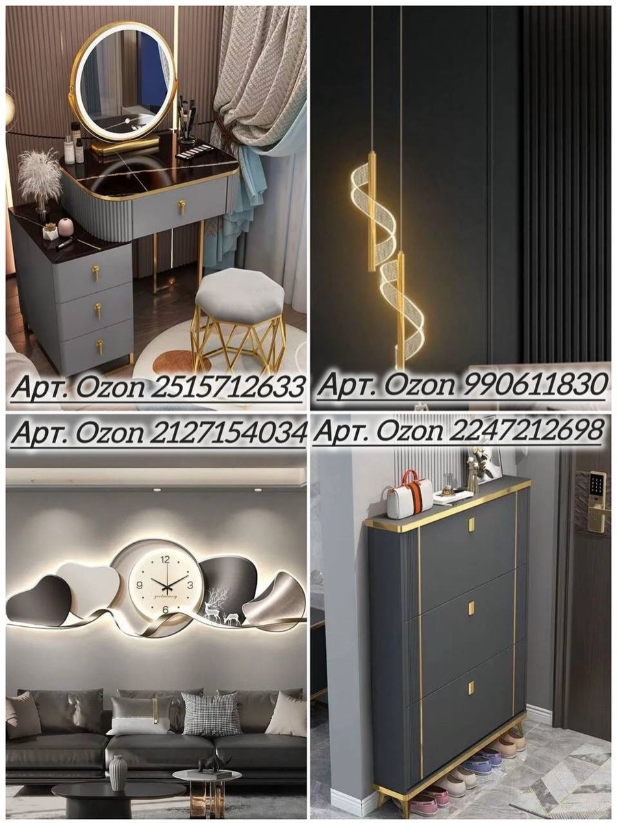 Есть вещи, которые просто стоят в комнате. А есть те, что создают впечатление: вы заходите — и пространство будто собрано в единый кадр, где всё на своих местах, свет работает как режиссёр, а детали добавляют статус и настроение. Подборка на фото как раз про это: выразительные светильники, зеркала, настенный декор и акцентная мебель в благородной гамме графита, золота, тёплого дерева и мягких молочных оттенков.