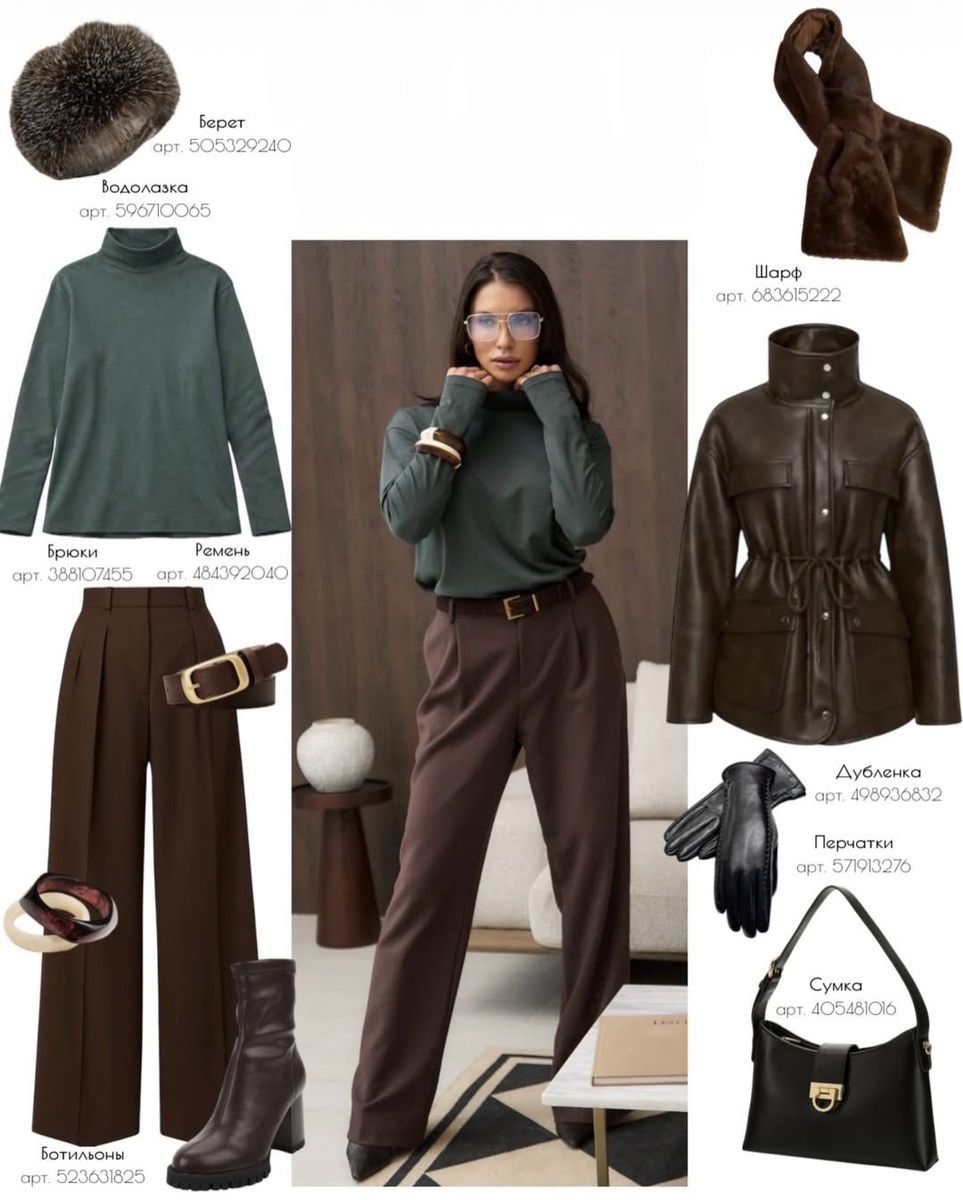 - Тёплая шоколадная база (брюки, шарф) — создаёт мягкий статус вместо жёсткого чёрного.