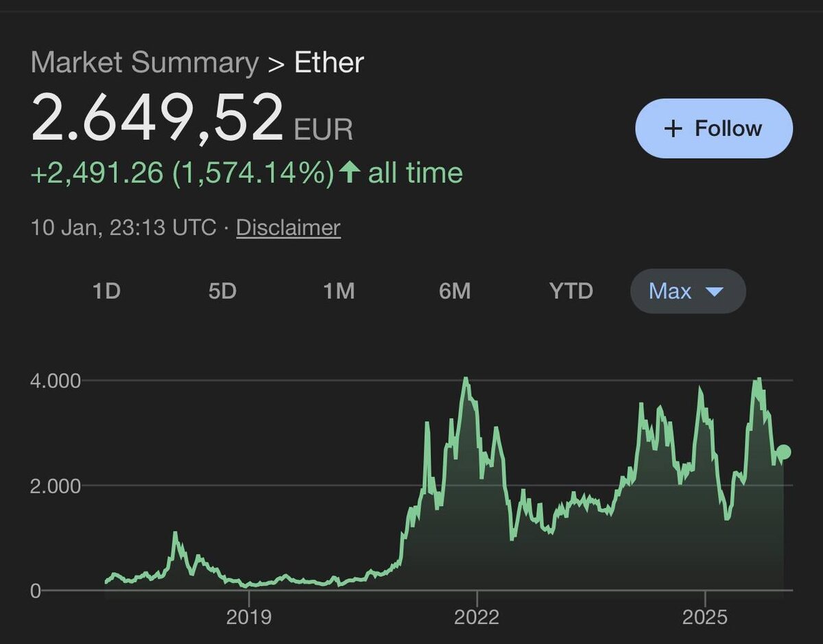 » Часто слышу: «Если бы я вложил $10 000 в Ethereum в 2014 — сегодня был бы со $100 млн». Нет. Если честно прокрутить плёнку назад, картина выглядит иначе. $10k превращаются в $500k — и ты ничего не делаешь. Потом в $7M — и всё ещё ничего. Потом $7M сжимаются до $195k — и ты держишь. $195k снова вырастают до $15M — ты держишь. $15M превращаются в $600k — ты держишь. $600k летят к $46M — ты держишь. $46M падают до $2.6M — ты держишь. $2.6M разгоняются до $160M — ты держишь. $160M усыхают до $27M — ты держишь. $27M снова идут к $100M — и вот тут, вдруг, ты решаешь что-то сделать. Вот тогда — да. $10k в 2014 действительно превращаются в $100M. И в этой истории самое нереалистичное — не рост Ethereum. Самое нереалистичное — человек, который ничего не делает на каждом из этих этапов. Рынок — это не график доходности на презентации. Это психологическая мясорубка. Где «цикл всё расставит», но только если ты сам не сломаешься раньше. Интересно, вы бы так смогли? #eth