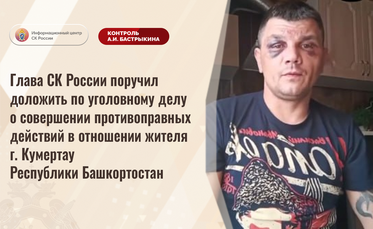 Глава СК России поручил доложить по уголовному делу о совершении противоправных действий в отношении жителя г. Кумертау Республики Башкортостан В сети Интернет размещено обращение жителя города Кумертау Республики Башкортостан по вопросу совершения в отношении него противоправных действий. В январе текущего года шестеро мужчин, используя малозначительный повод, жестоко избили участника СВО, а также похитили его личные вещи. Пострадавшему потребовалась медицинская помощь. В СУ СК России по Республике Башкортостан расследуется уголовное дело. Председатель Следственного комитета Российской Федерации Александр Иванович Бастрыкин поручил руководителю СУ СК России по Республике Башкортостан Владимиру Владимировичу Архангельскому доложить об установленных в ходе проведенных следственных действий обстоятельствах, а по завершении расследования уголовного дела – о его результатах. Исполнение поручения поставлено на контроль в центральном аппарате ведомства. #СледственныйКомитет #СКРоссии #СК #И