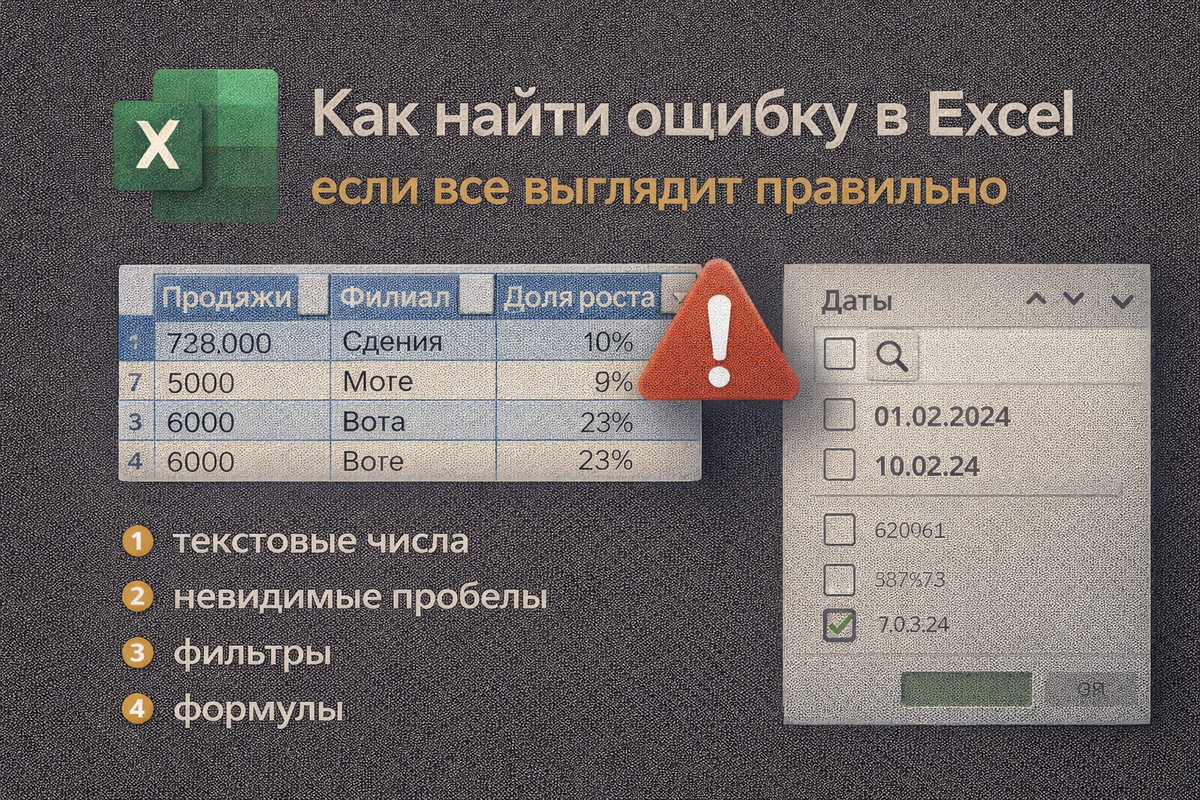 Как найти ошибку в Excel, если всё выглядит правильно, самые коварные случаи. Практика поиска скрытых ошибок в Excel: текстовые числа, пробелы, фильтры, даты и формулы, которые врут без предупреждений. Потому что:
