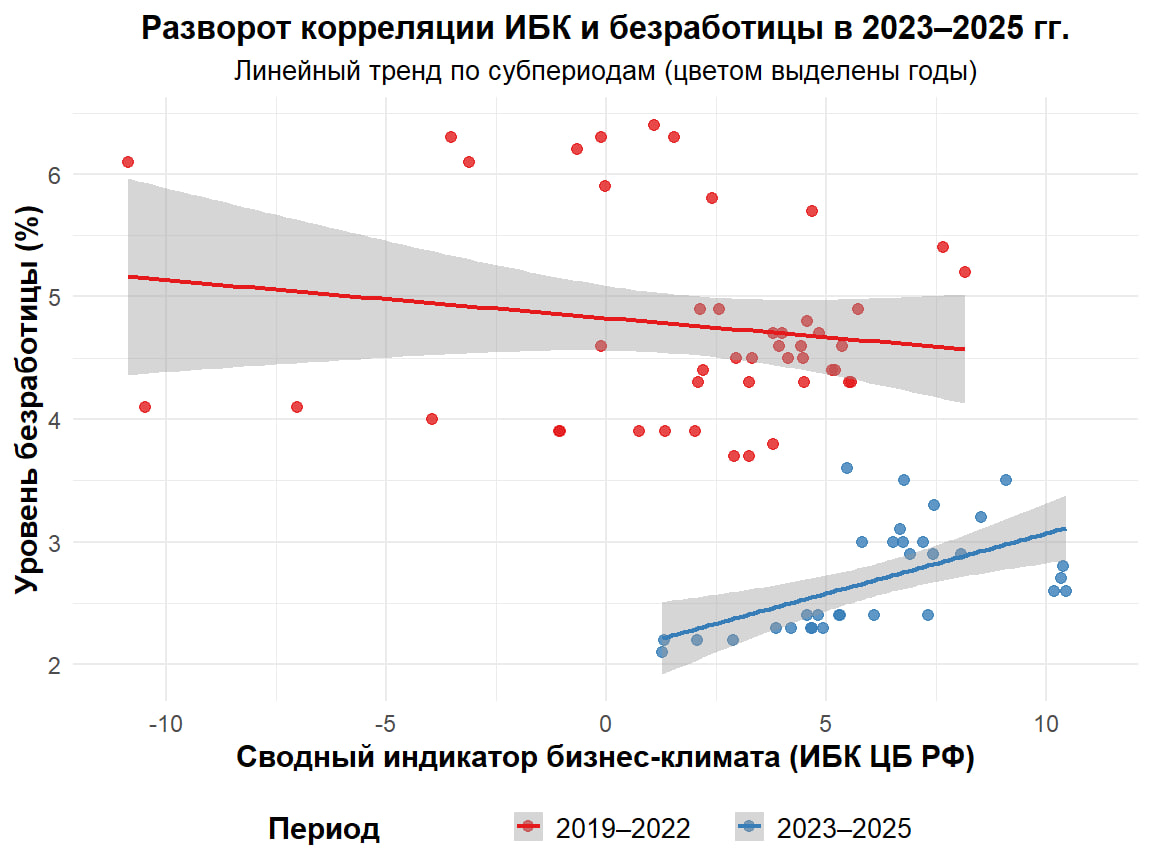 Когда чуваки сверху заявляют, что у нас самая низкая безработица, и это хорошо, я вижу эту диаграмму. Смотрите на график внимательно. По оси X – Индикатор бизнес-климата Центробанка (я даю их аналитику в канале, см. Температура кадрового рынка: опрос ЦБ ), ось Y - % безработицы – помесячно. До 2022 года всё было правильно: экономика чувствует себя лучше → ожидания бизнеса растут → безработица падает. Красная линия — учебник, Макро-101, никаких сюрпризов. А потом рынок труда сломался. С 2023 года происходит абсурд: ожидания бизнеса улучшаются — безработица растёт. Синяя линия идёт вверх. Это не шум и не «временное искажение». Это структурный разрыв, подтверждённый статистически. Безработица перестала быть индикатором напряжённости рынка труда. Почему: ....... я сначала дал несколько причин, но на самом деле я не знаю. Хотел бы услышать ваши гипотезы экономика реагирует, бизнес ожидает, а безработица делает вид, что «все спокойно». Фактически мы наблюдаем разрыв между реальными процесса