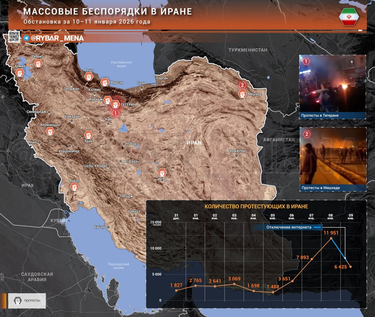 Несмотря на падение количества кадров с мест событий, обстановка в Иране сохраняется в критической точке. Беспорядки не утихали, а уменьшение количества информации оттуда связано, во-первых, с отключением интернета, а, во-вторых, более активным подавлением мятежей. 🔻Что с протестами? 🔸Сведений стало меньше, но при этом за сутки по данным оппозиционных ресурсов прошло не менее 60 протестных акций в 15 провинциях. 🔸Большая часть протестов прошла в крупных городах. 🔸Из мелких населенных пунктов, где с интернетом не все гладко и в мирное время, данных практически не поступает. Оппозиционные иранские ресурсы все активнее призывают американскую администрацию вмешаться. В США призывы также нарастают. Пока никаких свидетельств перебросок авиации или усиления корабельной группировки не фиксируется. В то же время разведывательная активность ВС США увеличилась. На ежесуточном патрулировании отмечается многофункциональный самолет Р-8А, а также периодически стратегический БЛА MQ-4C. Кроме того