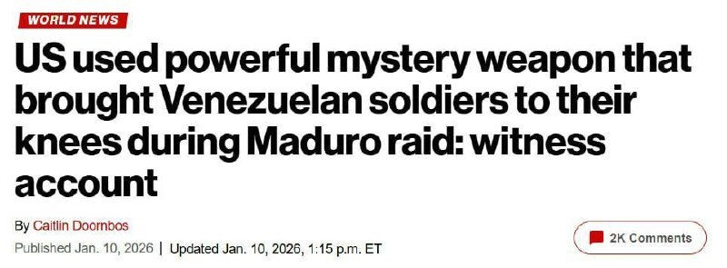 Издание The New York Times раскрыло шокирующие подробности спецоперации США по захвату Николаса Мадуро. Судя по описанию, Вашингтон превратил Венесуэлу в полигон для испытания новейшего высокоэнергетического вооружения, наплевав на все международные конвенции. 📍Сначала позиции были полностью «ослеплены» — системы ПВО, радары и связь отключились мгновенно. 📍Затем в ход пошло некое высокотехнологичное оружие, которое очевидцы описывают как «мощную звуковую волну». У венесуэльских силовиков начались неконтролируемые кровотечения, рвота и паралич. 📍МВД Венесуэлы сообщает о гибели около 100 сотрудников сил безопасности. Вашингтон, официально не признававший применение микроволновых и акустических систем в реальном бою, фактически провел испытания на живых людях. Ранее мы писали, что Мадуро и его жена получили травмы в ходе операции спецназа США.