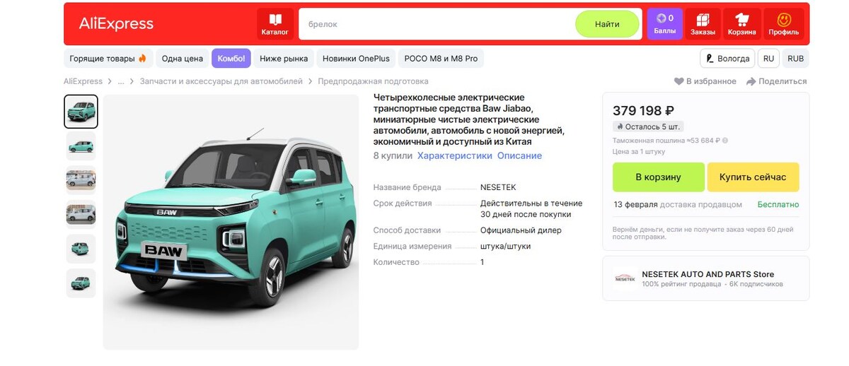 Купить новый авто в Китае по цене убитой Гранты? Легко! Покупка автомобиля в России давно перестала быть простой задачей. Цены на новые машины начинаются с миллиона рублей, а рынок подержанных авто все чаще разочаровывает состоянием и пробегами. На этом фоне все больше внимания привлекают альтернативные варианты, и один из них — покупка компактного китайского электромобиля Baw Jiabao напрямую с AliExpress. Стоимость такого автомобиля составляет около 380 000 рублей. С учетом таможенной пошлины, которая в среднем выходит около 50 000 рублей, итоговая цена оказывается в районе 420–430 тысяч рублей. Даже по нынешним меркам это выглядит почти фантастически: полноценный автомобиль дешевле многих мотоциклов и квадроциклов. Baw Jiabao — это небольшой городской электромобиль, рассчитанный в первую очередь на повседневные поездки. Он не претендует на роль семейного авто для дальних путешествий, но отлично подходит для города. Компактные размеры позволяют легко парковаться, а электродвигатель
