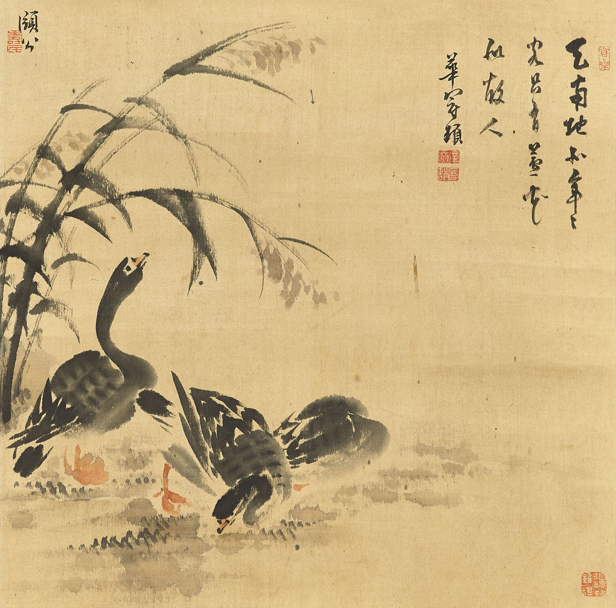 Бянь Шоумин — один из заметных мастеров живописи эпохи Цин. Его имя часто связывают с художественной средой Янчжоу и предполагаемым участием в группе Восемь чудаков Янчжоу, объединявшей художников с индивидуальной манерой и свободным отношением к академическим канонам. Бянь Шоумин получил известность благодаря изображениям диких гусей — мотиву, который со временем стал его художественной подписью. Эти образы вошли в историю под названием бяньянь (边雁), или «бяньские гуси». Художник неоднократно возвращался к этой теме, варьируя композицию, ритм и масштаб, но сохраняя узнаваемую логику изображения. В его работах гуси не выступают декоративным элементом. Они включены в пространственную структуру листа и связаны с окружающей средой — водой, тростником, пустотами бумаги. Лаконичный рисунок, сдержанная цветовая палитра и точный ритм мазка формируют цельный образ, в котором внимание сосредоточено на движении и характере птиц. Помимо живописи, Бянь Шоумин был известен как каллиграф и поэт. Его