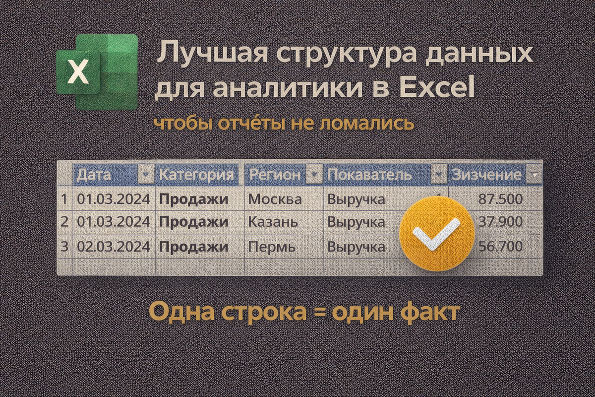 — столбцы «на глаз» Excel терпит. Аналитика — нет. Одна строка = один факт. Не отчёт, не итог, не результат. Факт: