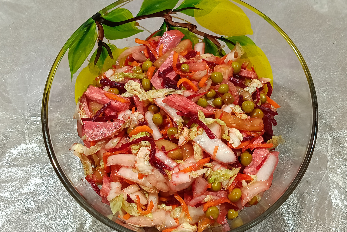 Хотела именно так, чтобы не только овощи, а и мясная составляющая. Вместо колбасы ( у меня сервелат ), можно использовать курицу, копчёную , варёную или запечённую.