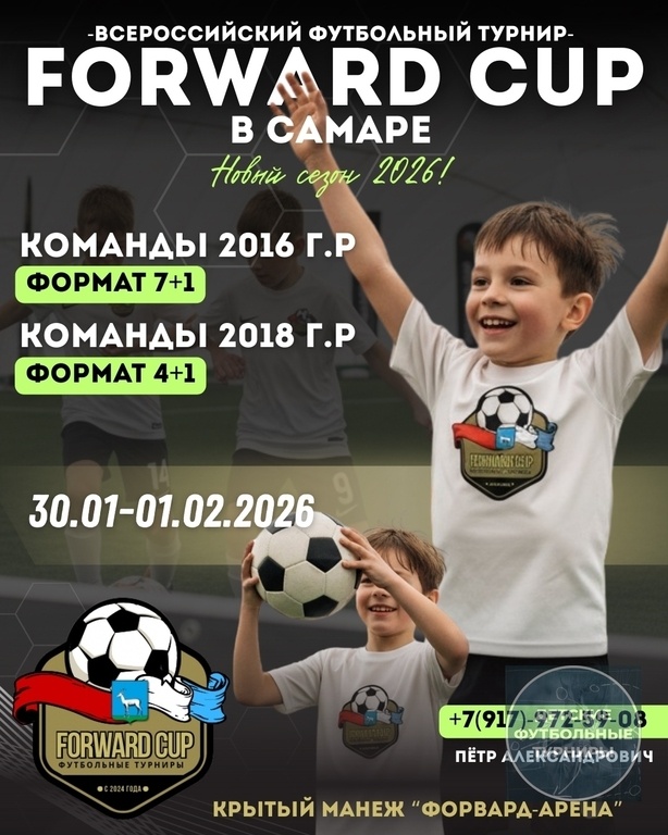! ⚽🎉 Представляем вашему вниманию афишу первого турнира лиги Forward Cup сезона 2026! И уже совсем скоро стартует наш первый турнир 🔥 Футбольная лига FORWARD CUP | г.Самара (https://vk.com/club227649300) 📅 Даты проведения: 30 января – 1 февраля 2026 года 🏆 Категории и форматы: ⚽ 2016 год рождения — формат 7+1 (с правилом «вне игры») ⚽ 2018 год рождения — формат 4+1 📍 Место проведения: Крытый манеж «Форвард-Арена» г. Самара, ул. Хасановская, 22 ФОРВАРД АРЕНА (ФУТБОЛЬНЫЙ МАНЕЖ (https://vk.com/club224275781)IСАМАРА) ✨ Современное поле, комфортные раздевалки, отличная атмосфера и профессиональная организация турнира — всё для яркого футбольного уикенда! 📞 По вопросам участия и подачи заявок: Пётр Севостьяненко Петр Севостьяненко (https://vk.com/id359845899) ☎ +7 917 972-59-08 Успейте подать заявку! 🚀⚽ -— #ФутбольныйТурнирЯнварь2026 #ФутбольныйТурнирЦентральнаяРоссия2026 #ФутбольныйТурнирСамара2026 #ФутбольныйТурнирСамара2016гр #ФутбольныйТурнирСамара2018гр Источник: https://v