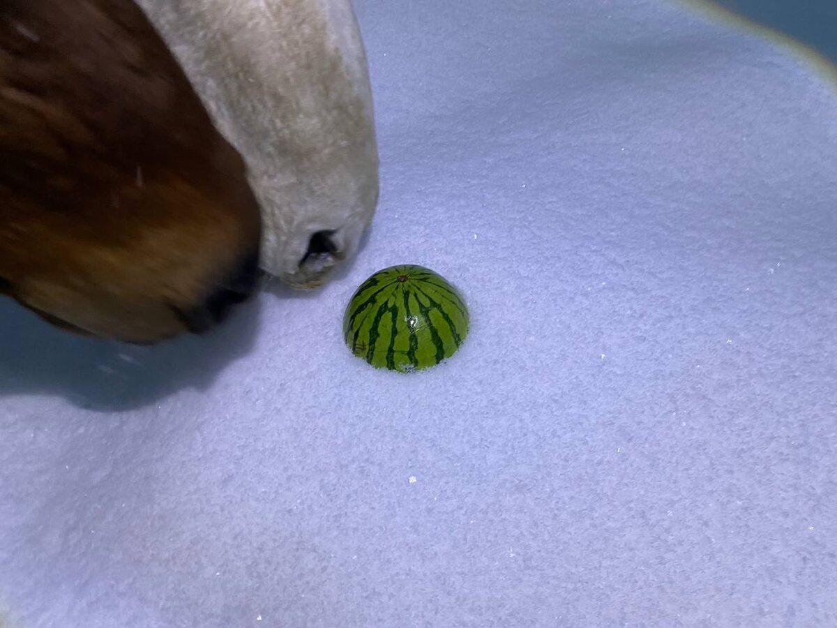Мы не сумасшедшие (точнее, не слишком), но сегодня наши звери с удовольствием хрумкали корками арбуза, который Ваня вчера неведомо где и как добыл (в середине-то января!). Я поначалу не поверила своим глазам. Кони, кажется, тоже. Киф и Чино неспешно подошли на мой зов, а когда я указала им на положенную заранее неподалеку зеленую арбузную «попку», ярким пятном выделяющуюся на белоснежном снегу, тут же раздули ноздри и зафырчали. У них явно случился «когнитивный диссонанс» (и я их понимаю). Первым от шока отошел Кефир, хотя обычно именно рысак долго соображает и не сразу смиряется с реальностью, которая расходится с его представлениями о ней. Но тут, видимо, сработала сильная мотивация. Конь сделал два шага и практически заглотил всю арбузную корку разом. К счастью, в его благородный рот целиком она не влезла, и Чино тоже досталось немного угощения. Правда, забайкалец, кажется, никак не мог свыкнуться с мыслью о том, что он в январе ест арбуз, потому что жевал медленно и по чуть-чуть,