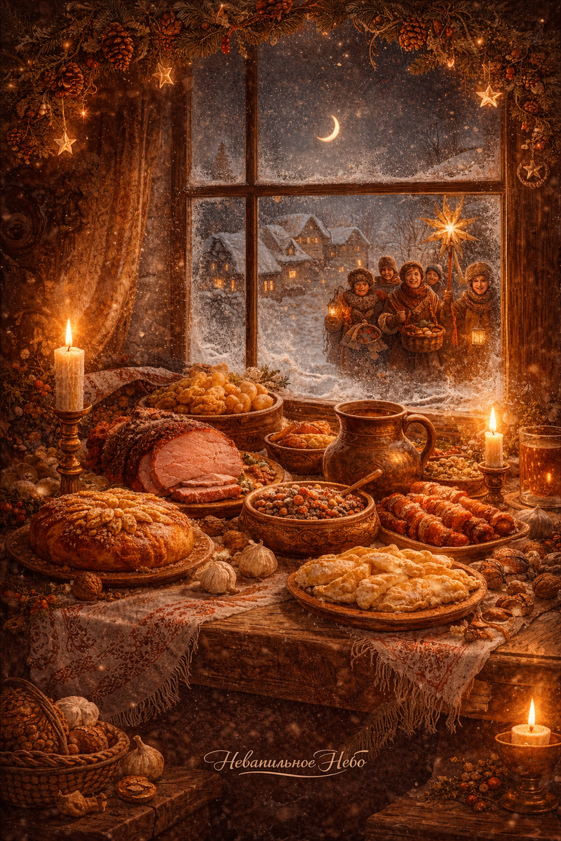 - Накрыть щедрый стол — приготовьте кутью (пшеница/перловка + мёд + мак/орехи/изюм), вареники, блины, блюда из свинины (холодец, колбаса). Чем богаче и вкуснее — тем лучше год пройдёт. Главное — не жадничать, угощать всех, кто зайдёт.