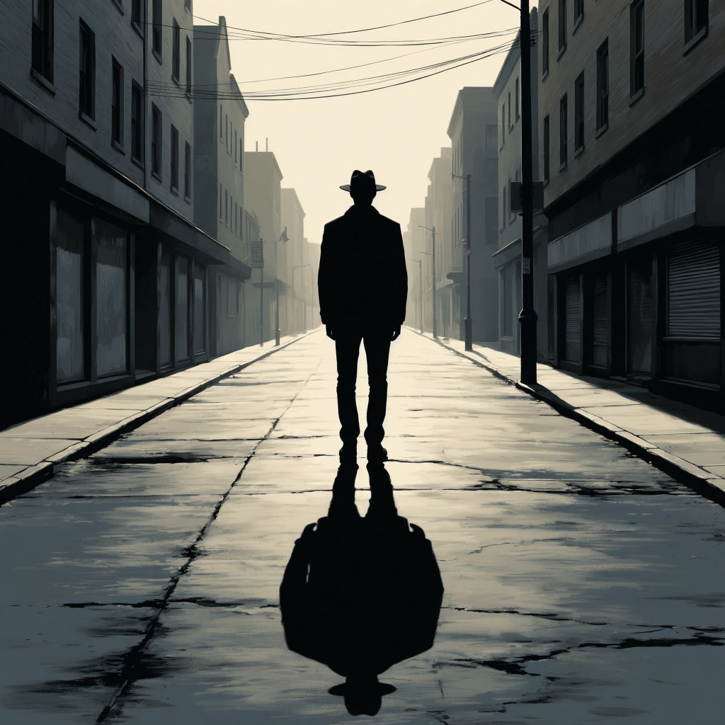 На углу, у старого трансформаторного щита, стоял человек. Высокий, худой, в длинном тёмном пальто и шляпе. Не современной, нет — высокой, узкой, будто из чёрно‑белого фильма. Поля скрывали лицо, оставляя лишь тёмный провал, в котором не разглядеть ни глаз, ни черт
