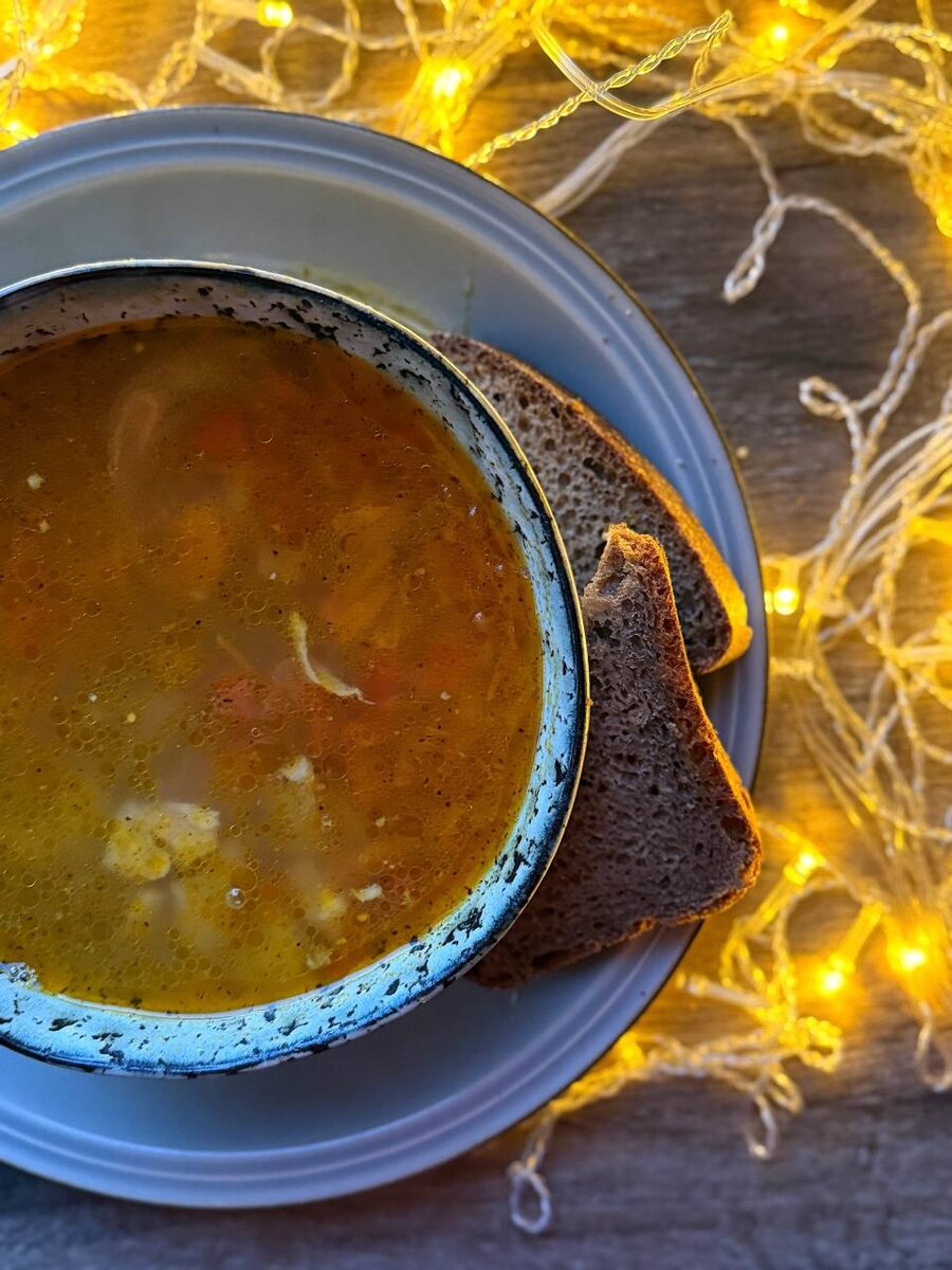 Такой мама в детстве готовила, а я случайно слепила его из того, что было здесь на Алтае с учетом ассортимента из магазина «Ромашка». В итоге, ела это величайшее творение человечества три дня подряд на обедо-ужин, потому что просто и капец как вкусно! Из чего: • сладкий перец 1/2 шт • морковь 1/2 шт • томаты 1/2 шт крупного размера • лимон: 2 дольки толщиной 2 мм • специи: черный перец, куркума по 1/4 ч. • соль 1/2 ч.л • лавровый лист 2 листика • курица любые части 300г • гречка 5-6 ст.л Как готовить: Курицу варим до готовности. За минут 10 до готовности курочки, добавляем в кастрюлю гречку, черный перец и лавровый лист, немного соли Параллельно, пока варится бульон делаем зажарку: на сковороде с оливковым маслом пассируем нарезанные мелким кубиком помидор с перчиком и натертую на мелкой терке морковку, солим, добавляем черный перец и куркуму. Дальше добавляем зажарку в кастрюлю, даем настояться еще мин 10 – суп готов. Курицу по желанию можно достать и нарезать мелкими кусочками в