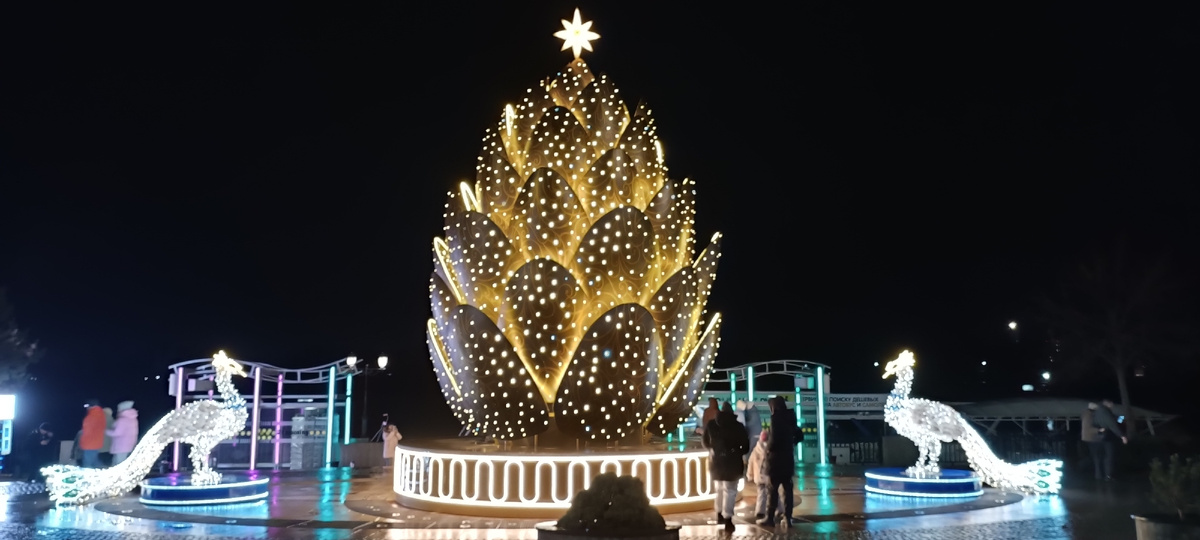 Ёлка-шишка, павлины, розы, сказочная иллюминация на набережной Ростова-на-Дону.