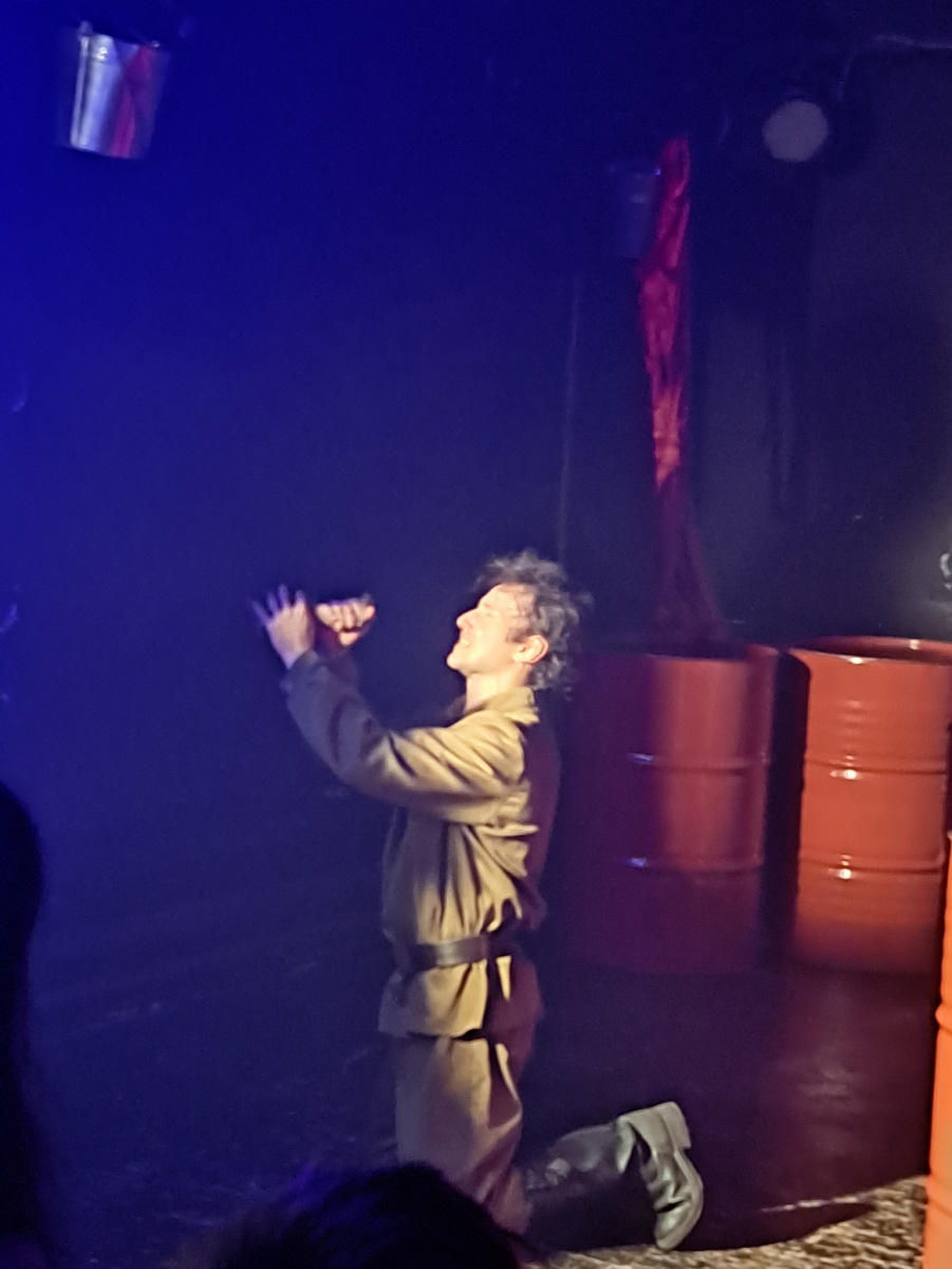 "А зори здесь тихие" - оживают на сцене. Перед нами обычные девушки, вчерашние школьницы, чьи-то дочери, матери. Они на войне, где гибнут люди, ведут простую жизнь, ходят за щавелем, прихорашиваются и строят глазки симпатичному старшине, поют развеселые частушки. А рядом уже бродит Бог (Татьяна Вижновец), готовых принять на той стороне души и поющий песню Людмилы Зыкиной «Гляжу в озера синие», и так же безобразная старуха-смерть зайдет на огонек, когда придет время. Режиссерская находка, когда умершие остаются с живыми на одной сцене, чтобы сражаться за Родину попадает в самую душу. Зритель понимает, никто не забыт, даже мертвые, все они с нами, в тяжелый час, чтобы поддержать и спасти.