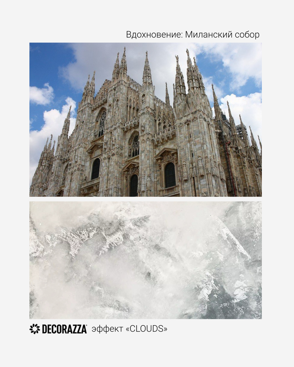 Миланский собор – редкий пример готической архитектуры, целиком выстроенной из мрамора. Его стены выполнены из светлого кандольского мрамора, чувствительного к свету и погоде: при рассеянном освещении он выглядит холодным и почти фарфоровым, а на солнце теплеет, приобретая мягкий кремовый оттенок. Фасады и интерьеры собора не читаются как плоскости – рельеф дробит свет, превращая его в полутона и тени. Тысячи шпилей, резьба и глубокие вертикали создают ощущение воздуха и высоты, масштаб которых растворяется в световой глубине. Эффект «Clouds» переносит эту логику в интерьер. Мягкие, размытые переходы оттенков формируют поверхность без четкого рисунка – она живет светом и меняется вместе с ним. При естественном освещении стена выглядит воздушной и сияющей, в теплом искусственном – становится глубже и спокойнее. Многослойная техника нанесения создает объем без резких акцентов, добавляя пространству динамику и визуальную легкость – как облачный слой, который невозможно зафиксировать, но л