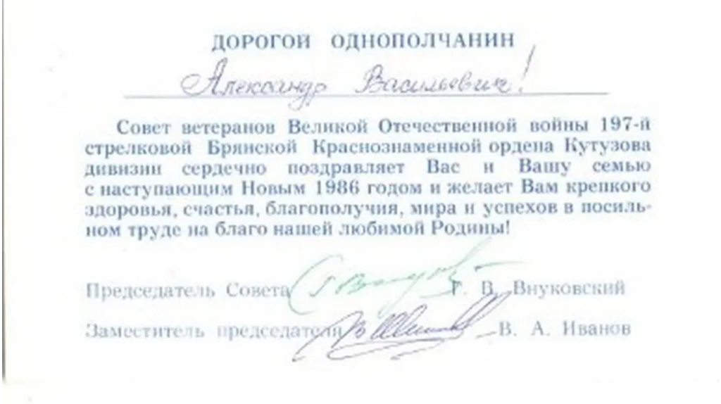 Текст внутри открытки адресован однополчанину Александру Обухову. Поздравление подписали председатель и заместитель председателя Совета ветеранов 197-й стрелковой Брянской Краснознамённой ордена Кутузова дивизии. В открытых источниках появилось изображение новогодней открытки, подготовленной Советом ветеранов Великой Отечественной войны 197-й стрелковой Брянской Краснознамённой дивизии, награждённой орденом Кутузова. Архивное поздравление было адресовано одному из фронтовых товарищей. Как следует из представленных данных, открытку отправили в 1985 году. На оборотной стороне указаны сведения об авторе иллюстрации — художнике Леониде Кириллове, а также о типографии «Красный пролетарий», где осуществлялась печать. Отмечается, что стоимость такого поздравительного комплекта вместе с конвертом в тот период составляла 17 копеек. Текст внутри открытки адресован однополчанину Александру Обухову. Поздравление подписали председатель и заместитель председателя Совета ветеранов дивизии. Ранее брян