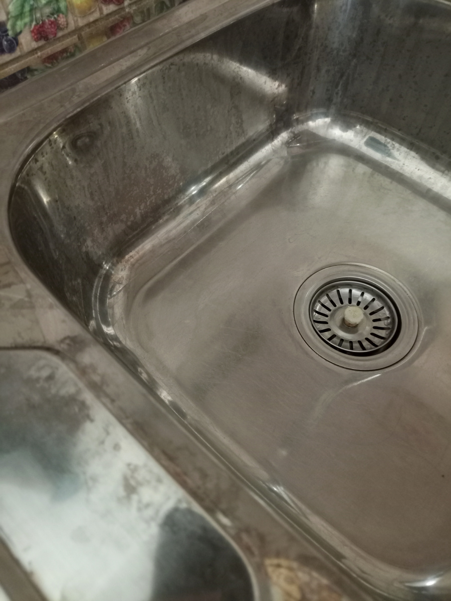 Сразу скажу, что хозяйка из меня так себе. Ну не получается у меня постоянно всё намывать, натирать, в идеальной чистоте содержать. Вот и мойку кухонную я подзапустила. Вода у нас известковая, если постоянно насухо не вытирать, то образуется налёт.