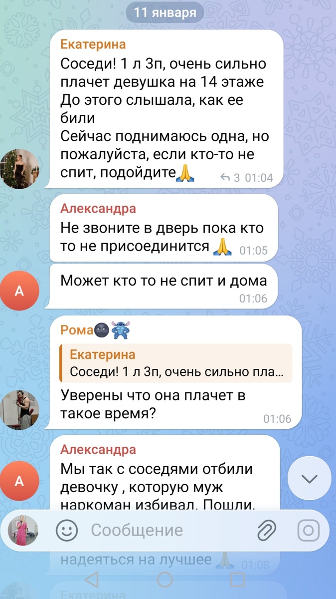 Вторая девушка, её соседка, не могла это все просто так слушать и в час ночи попыталась кого-то в чате позвать из мужчин, чтобы проверить, возможно пострадавшей нужна помощь. Одно идти боязно.