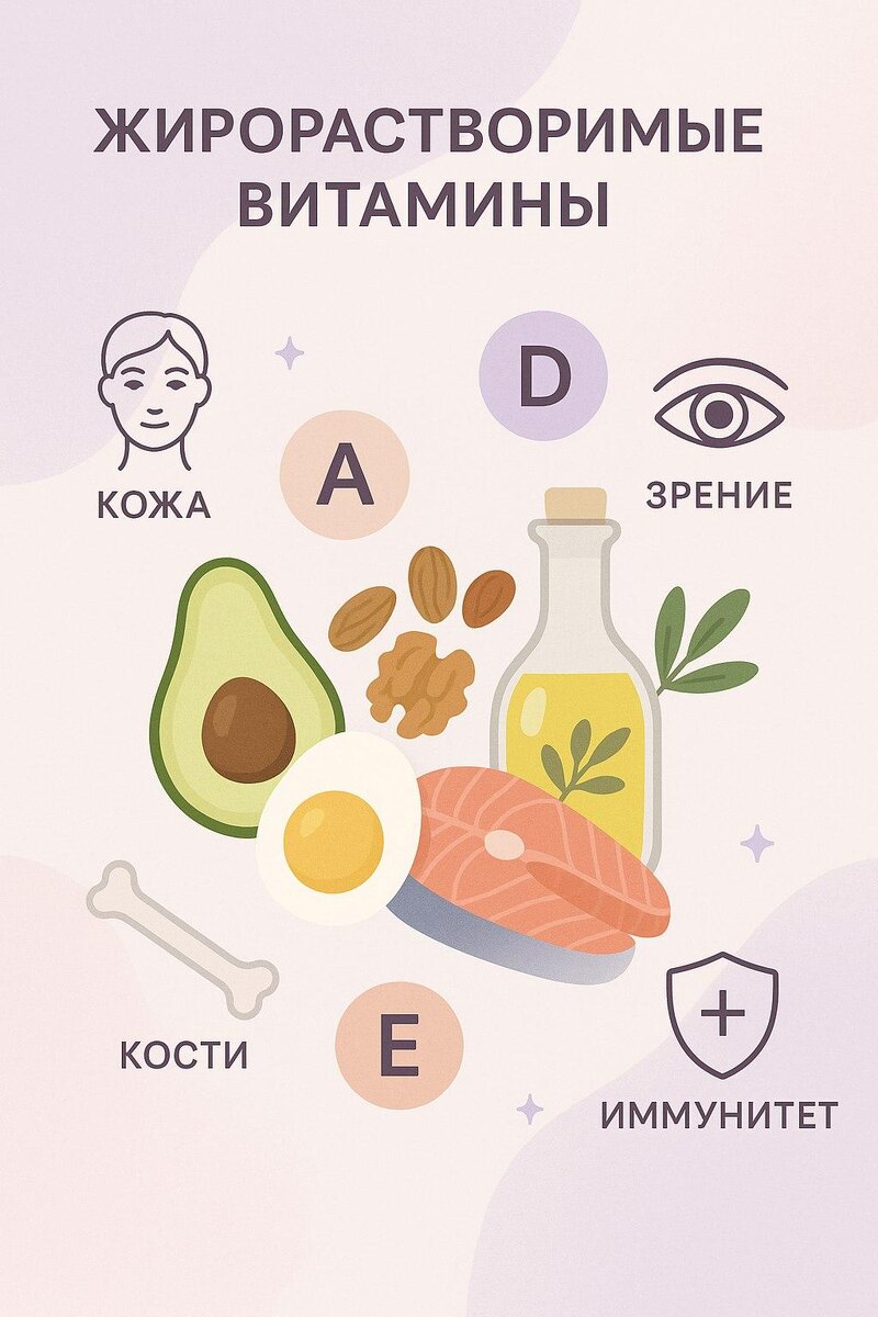 Не все витамины одинаково «любят» воду - некоторые из них требуют жиров, чтобы усвоиться. Именно поэтому витамины A, D, E и K называют жирорастворимыми. 💡 Почему это важно знать: Если в рационе не хватает полезных жиров, даже самые дорогие витамины могут просто пройти транзитом. ⠀ ✨ Особенности жирорастворимых витаминов: • Усваиваются только при наличии жиров в пище (например, с авокадо, орехами, яйцами, ложкой масла GHI). • Могут накапливаться в организме - особенно в печени и жировой ткани. • Дефицит развивается постепенно, но и передозировка при приеме добавок вполне возможна. 🧬 Роль и функции: 🔸 Витамин A - здоровье кожи, слизистых и хорошее зрение. 🔸 Витамин D - отвечает за обмен кальция и прочность костей, поддерживает иммунитет. 🔸 Витамин E - мощный антиоксидант, защищает клетки от повреждений. 🔸 Витамин K - регулирует свертываемость крови и участвует в метаболизме костей. 🥑 Как принимать: Жирорастворимые витамины лучше усваиваются, если принимать их во время или после ед