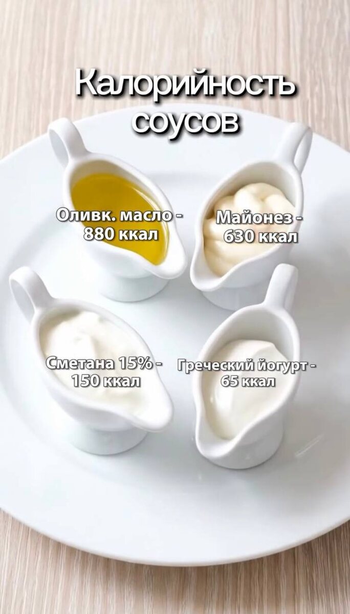 Когда мы считаем калории или просто стараемся питаться осознанно, чаще всего внимание идёт на основное блюдо: мясо, гарнир, овощи. А соус добавляем “по вкусу” - и именно он часто делает погоду в рационе 👇 📊 На 100 грамм: 🫒 Оливковое масло - 880 ккал 🍶 Майонез - 630 ккал 🥣 Сметана 15% - 150 ккал 🧁 Греческий йогурт - 65 ккал И вроде бы - кто ест 100 г масла? Но если посчитать - 1 столовая ложка оливкового масла это уже около 90 ккал, а майонеза - 60 ккал. А таких ложек за день может быть несколько - в салат, на гарнир, в заправку… В итоге можно “добрать” ещё 300–400 лишних калорий, даже не заметив этого. 💡 Вывод: Соус - это не “мелочь”, а полноценная часть блюда, которая влияет на общую калорийность. Но это не значит, что нужно есть все “всухую” - просто можно выбрать базу полегче: - заменить майонез на греческий йогурт (добавь горчицу, лимон, специи - и вкусно, и легче); - делать заправки на смеси йогурта и сметаны; - использовать масло дозировано - не на глаз, а хотя бы чайной л