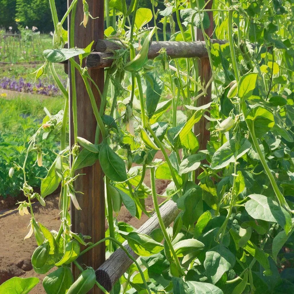 Выращивание растений с применением вертикальных опор позволяет увеличить урожайность и облегчить уход за культурами. Одним из таких методов является выращивание фасоли на шпалере – способ, при котором растения располагаются вертикально по сетке или проволоке, натянутым между столбиками или каркасом. Этот метод имеет ряд преимуществ перед традиционным горизонтальным способом посадки и ухода. ▌ Преимущества использования шпалеры: 1. Повышение урожайности: При вертикальном расположении растений увеличивается площадь освещаемой поверхности листьев, что способствует лучшему фотосинтезу и повышает продуктивность каждого куста. 2. Экономия пространства: Шпагатная посадка позволяет разместить большее количество кустов на ограниченной площади, что особенно актуально для небольших огородных участков. 3. Удобство сбора урожая: Фасоль легче собирать, так как плоды находятся выше уровня земли и хорошо видны; это также уменьшает вероятность повреждения плодов во время уборки. 4. Уменьшение риска за