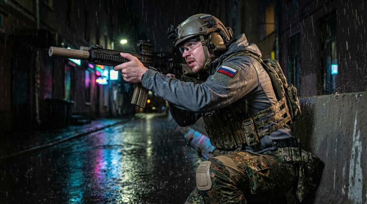 🔠🔠🔠🔠🔠🔠🔠 🦋 Промт для мужиков из серии "Милитари" 3 из 7 Use the uploaded photo to reference your face and appearance. Keeping the facial features and not changing. Keep 100% similarity. Low angle medium shot of a muscular special forces operator in a tense crouched position behind a concrete barrier, aiming a customized HK416 assault rifle down a dark alley. Heavy rain pouring down, soaking the grey tactical softshell hoodie and Flecktarn camouflage combat pants. Plate carrier vest with Russian tcar Petr 1 gerb patch clearly visible, ballistic helmet with NVG, comtac headset, tactical glasses, gloved hands, drop-leg holster. Water splashing off gear, neon lights reflecting on wet pavement in a gritty urban environment at night. Dramatic volumetric lighting, cinematic color grading, hyper-realistic action still --ar 16:9 --v 6.0 Заказать промт или фотосессию. ✉️ Буст канала. ⚡️ #нейросеть #aiфотосессия #промтыдляфотографа #мужскойпромт