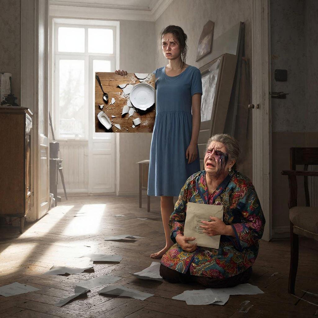 Она взглянула — и отпрянула, как от удара током. Она увидела. Увидела свои осколки, превращённые в искусство. Увидела свою ложку — орудие насилия — в центре композиции. Увидела, как её «творческий порыв» стал музейным экспонатом о бытовой жестокости.