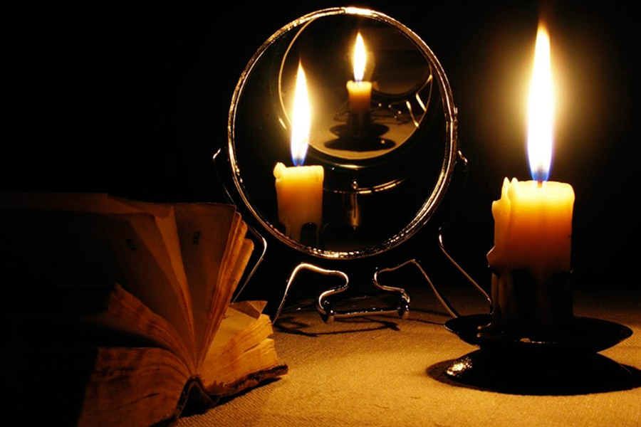Зажгли свечи. Поставили зеркала . Я воды налила у стакан и кольцо венчальное туды опустила. Игвеня с зеркалами села. Третья ждёт своей очереди.