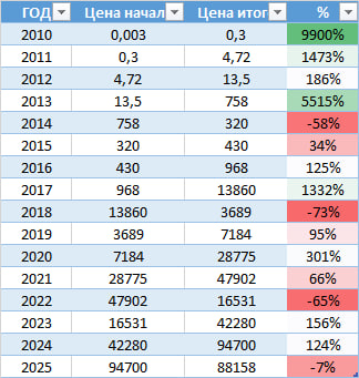 Год выдался не самым удачным — и, кажется, этого не ждал почти никто. Про альтсезон и вовсе молчу: его всё ещё кто-то ждёт? По итогам года: • BTC: −7% • ETH: −11% Оба результата хуже, чем у S&P 500 и даже индекса РТС. Признаюсь, такая картина меня удивила. Но повода для расстройства я здесь не вижу. Инвестиции — это всегда история в долгую, и один отдельно взятый год не говорит практически ни о чём. Выше — таблица по BTC, в комментариях выложу аналогичную по ETH. Если отбросить аномально высокие темпы роста до 2013 года, получаем следующую картину: с 2014 года • средний годовой рост — 169% • медиана — 81% с 2020 года • средний рост — 96% • медиана — 95% Если циклы всё ещё работают хотя бы частично, то 2026 год может оказаться не самым радужным. Есть даже прогнозы падения к 30 000 $, что означает −66% от текущих уровней — и, как ни странно, это не выглядит чем-то невозможным. Зато в 2027–2028 годах я жду сильное движение вверх. Статистика и средние значения роста имеют свойство «брать с