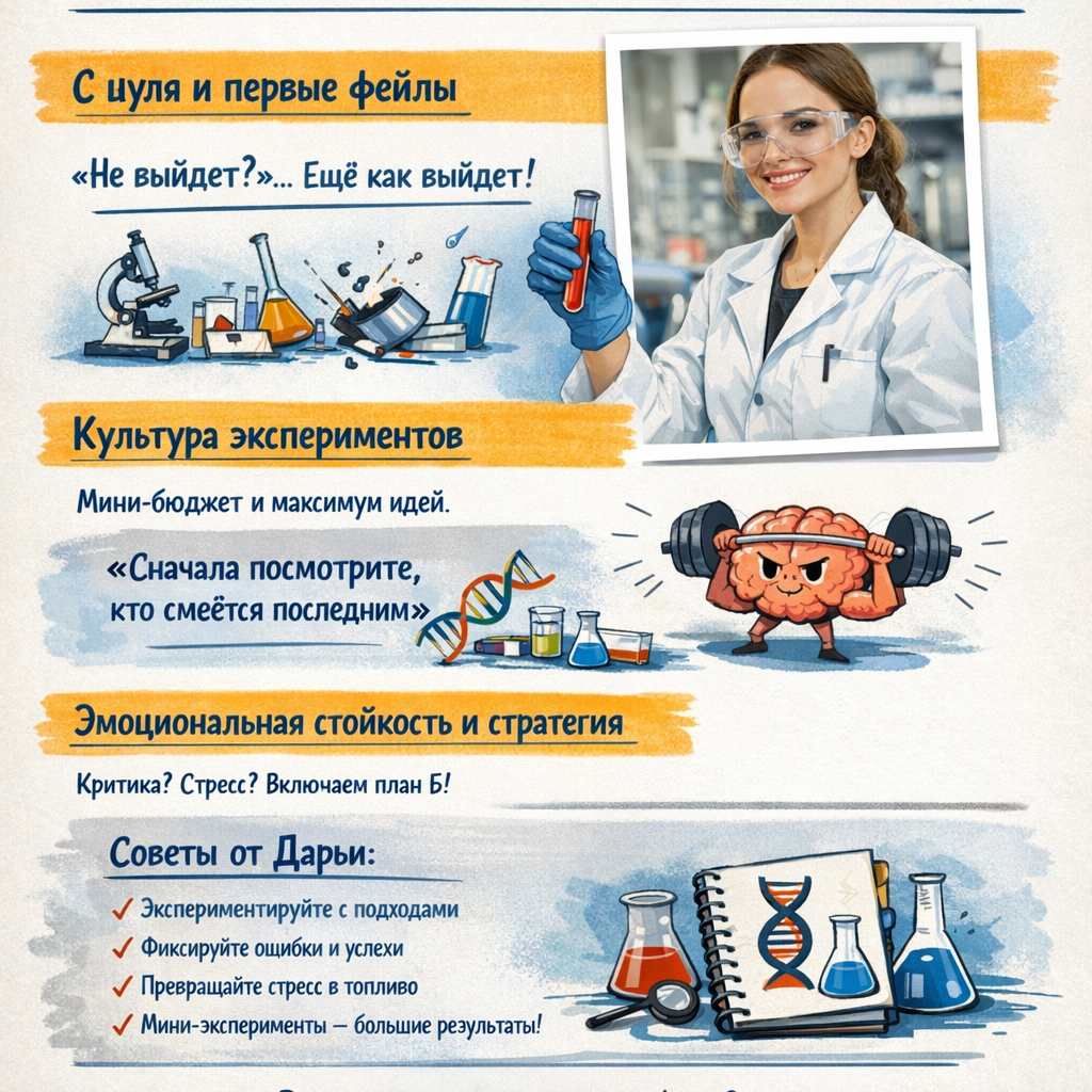 Вы когда-нибудь видели, как человек берёт пробирку, думает «а что если…», и через пару лет весь мир обсуждает его эксперименты? Нет? Тогда вы не видели Дарью Котову. Девушка, которая начинала с нуля, терпела провалы, сталкивалась с критикой коллег и делала тупейшие ошибки, но в итоге её CRISPR-стартап уже на слуху. И путь к этому… держитесь, будет жарко. Санкт-Петербург, середина 2010-х. Дарья с микроскопом, ноутбуком и стопкой идей, которые могли бы напугать любого профессора. Первые эксперименты — полный трэш: клетки не росли, гены отказывались редактироваться, реактивы заканчивались в самый неподходящий момент, а коллеге случайно взорвалась пробирка прямо под носом. Дарья смотрит на пёструю лабораторную карту с каждой датой провала и думает: