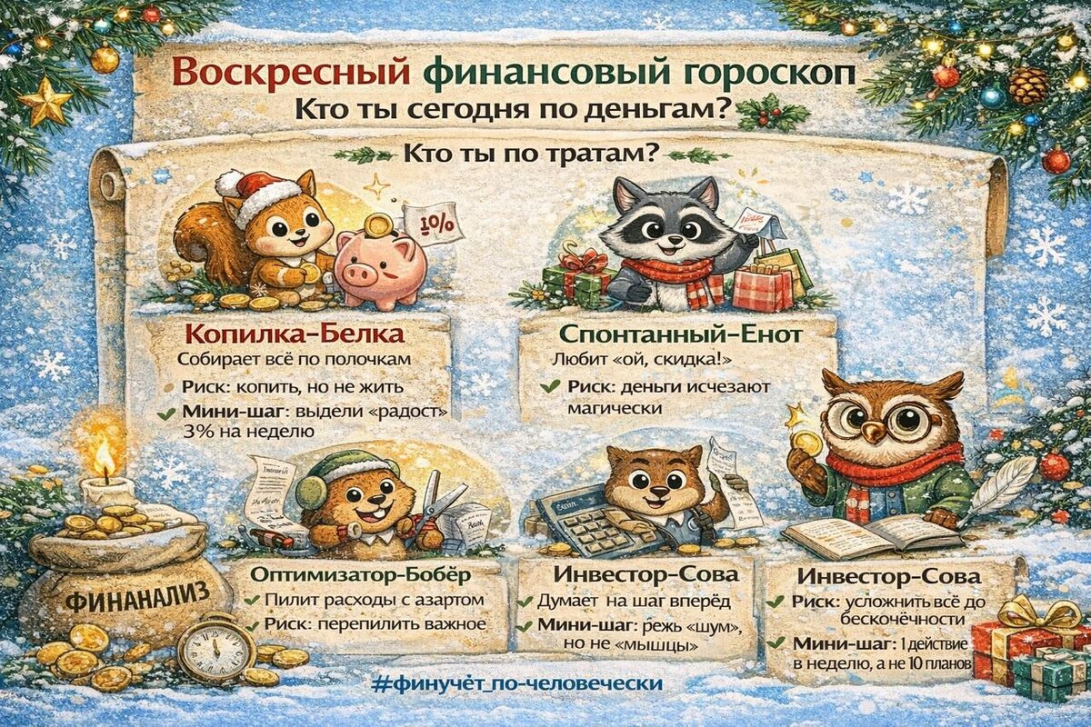 ) Кто ты сегодня по деньгам? Иногда лучший финанализ в воскресенье — это не “сводка за квартал”, а честный вопрос: я сегодня коплю, трачу, оптимизирую или строю будущее? 😄 Выбирай своего героя дня (или двух — мы же взрослые, нам можно): 🐿 Белка-копилка Собирает всё по полочкам. Риск: копить, но не жить. Мини-шаг: выдели бюджет на “радость” — и не ругай себя. 🦝 Спонтанный Енот Любит “ой, скидка!”. Риск: деньги исчезают магически. Мини-шаг: правило 24 часов для покупок дороже Х ₽. 🦫 Бобёр-оптимизатор Пилит расходы с азартом. Риск: перепилить важное. Мини-шаг: режь “шум”, но не “мышцы” (то, что приносит деньги/здоровье/рост). 🦉 Сова-инвестор Думает на шаг вперёд. Риск: усложнить всё до бесконечности. Мини-шаг: 1 действие в неделю, а не 10 планов. ✅ Воскресное задание (5 минут): Напиши одну покупку/статью расходов этой недели, которую ты бы: • оставил • уменьшил • заменил на более полезную А кто ты сегодня: 🐿 / 🦝 / 🦫 / 🦉 ? #финучёт_по-человечески