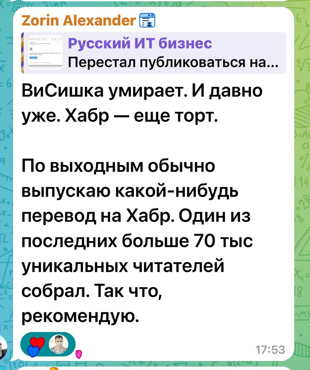 На Хабр раньше тоже писал, но как мне кажется, соотношение вложенных сил к результату не очень выгодно, по сравнению с обычным соц.сетями. Русский ИТ бизнес