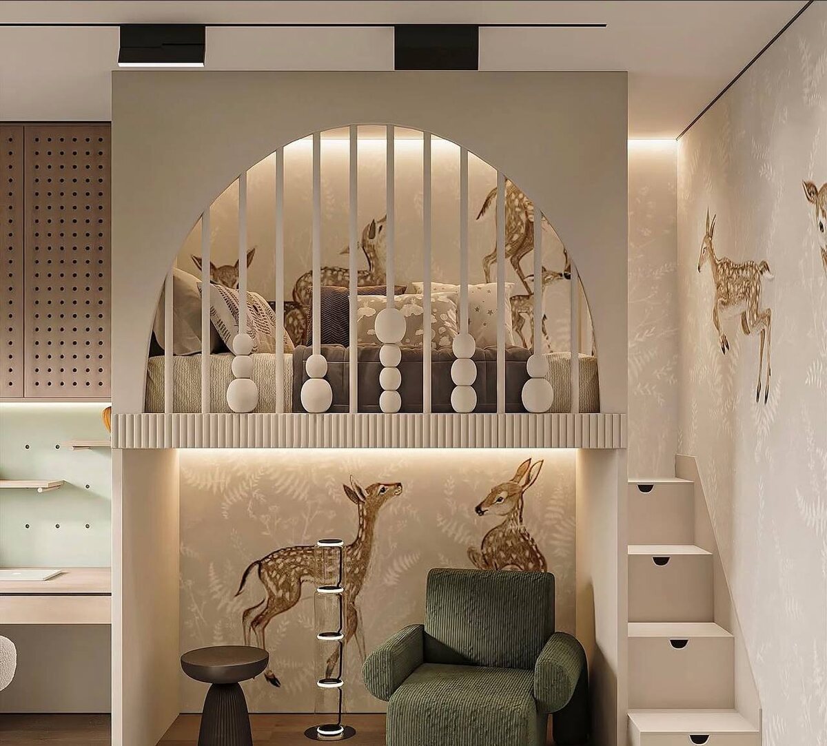 🌟🥰 Принты с растительными орнаментами и милыми оленятами создают настроение в комнате! Динамики этому интерьеру придает композиция под кроватью — кресло, торшер, журнальный столик и перила, которые имеют круглые элементы. Система хранения — отдельный вид искусства в этой комнате: рабочая зона с системой хранения, большой вместительный шкаф и даже ступеньки ведущие к кровати с выдвижными ящиками 🔥 А как вам дизайн? #детскаядляребенка #детскаядляодного #детскаядлямальчика #детскаядлядевочки