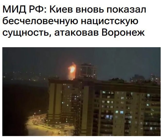 Киевский режим, нанеся удары по Воронежской области и другим регионам России, вновь продемонстрировал свою нацистскую сущность , — заявила официальный представитель МИД РФ Мария Захарова. «Киевский режим вновь продемонстрировал свою бесчеловечную нацистскую сущность, совершив очередное кровавое преступление... МИД России решительно осуждает эти акты терроризма. Их характерной чертой стало то, что в качестве целей предельно цинично было выбрано максимальное число гражданских объектов». https://dzen.ru/id/6425916a1950720421f18802