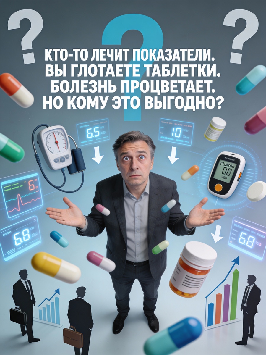 Системная проблема современной медицины ??? Все эти симптомы - высокое давление, сахар, холестерин, лишний вес - это последствия одной корневой причины: инсулинорезистентности и метаболической дисфункции. Но система лечит каждый симптом отдельной таблеткой вместо устранения причины. Бизнес-модель хронических болезней. Фармацевтическая индустрия переориентировалась с лечения острых заболеваний на управление хроническими состояниями. Их бизнес-модель построена на том, чтобы «держать больше пациентов на их препаратах» длительно. Вылеченный пациент - это потерянный клиент, а пациент на пожизненной терапии статинами, антигипертензивными и метформином - это стабильный денежный поток. Современная система здравоохранения фокусируется на управлении симптомами - маскировании боли, подавлении воспаления, регулировании сахара, снижении давления - в то время как базовые причины продолжают тихо развиваться. Один человек принимает одну таблетку от головной боли, другую от вздутия, третью для сна