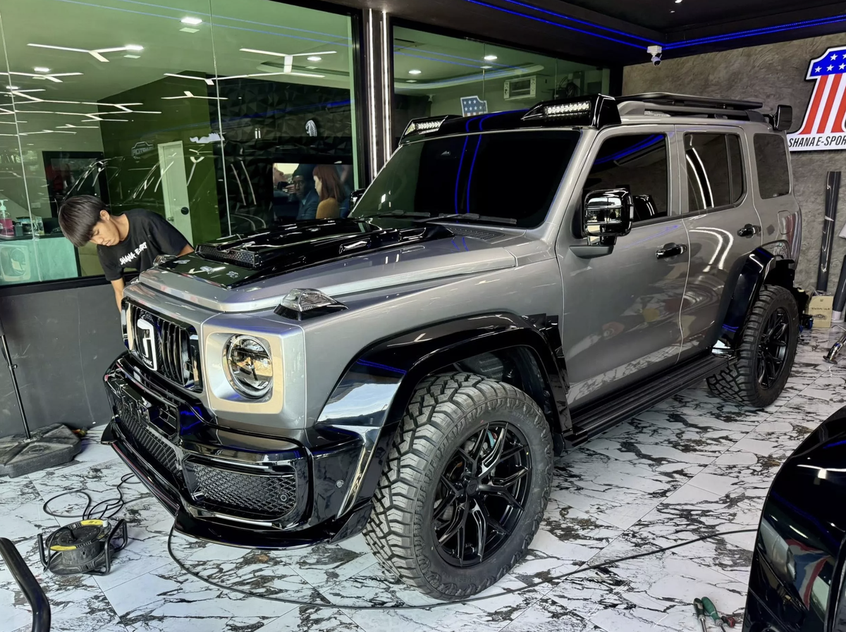 Если очень хочется ездить "на Брабусе", но бюджет упирается в суровую реальность, в Таиланде придумали выход. Там берут Tank 300 и тюнингуют его почти под G63. У Shana E Sport получился такой авто-косплей, с издалека кажущимся V8 и немецким ПТС. Тюнеры меняют морду целиком: новая решетка, круглые LED фары, капот с вентиляцией, бампер с "амгшными" воздухозаборниками и сплиттером. Крылья надули, прикрутили накладки и "жабры" в духе Brabus, сзади — другой бампер с диффузором, спойлер, чехол запаски и опционально либо четыре "ствола", либо имитация боковых выхлопов как у G63. Вся эта конструкция стоит на 22 дюймах с толстенной внедорожной резиной и, если не присматриваться, крайне легко спутать с чем то очень дорогим. Там, где мы откроем спецификацию. Под всем этим обвесом по прежнему Tank 300 с 2 л турбо и гибридной надстройкой, суммарно около 350 л.с. и полным приводом через девятиступенчатый автомат. Цифры для современного рамника сами по себе окей, но к миру Brabus V8 с 800+ л.с. и