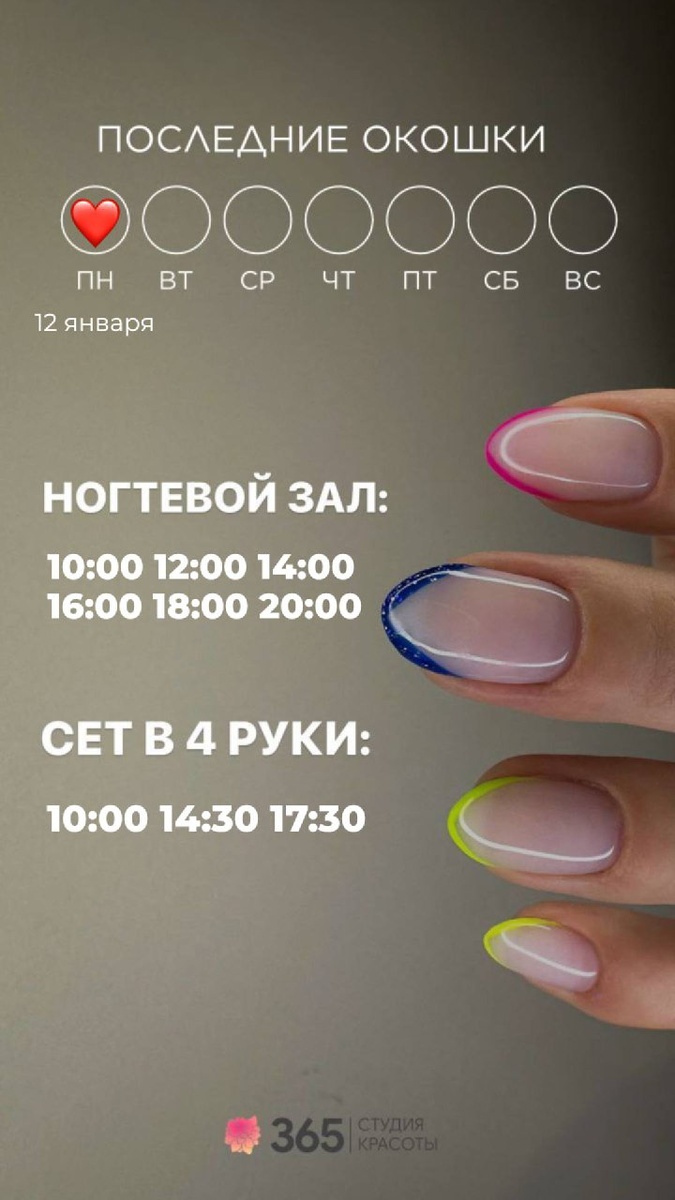 🥰 Пусть неделя будет легкой и результативной, с интересными задачами и отличным настроением!»😊 ❤️🎄.А мы как всегда будем рады видеть вас у нас в студии на услугах красоты🤩💅. #красота #наслаждение #забота #зима #любовь #мечты сбываются #радость #возможности ЧТО МОЖНО УСПЕТЬ СДЕЛАТЬ 12 января 2026 года : Ногтевой зал: 10:00 12:00 14:00 16:00 18:00 20:00 Сет в 4 руки: 10:00 14:30 17:30 Парикмахерский зал: 10:00 15:30 20:30 Оформление бровей и ресниц: ближайшая дата для записи 13 января Косметология/шугаринг: ближайшая запись на 16 января ЗАПИСАТЬСЯ МОЖНО ЛЮБЫМ УДОБНЫМ СПОСОБОМ: 👉🏻 Сообщение в Whats'app https://wa.me/79663654477 👉🏻По телефону +79663654477 👉🏻Онлайн запись https://n286444.yclients.com/ #команда365 #красота #наслаждение #забота #зима #январь #любовь #мечтысбываются #радость #возможности